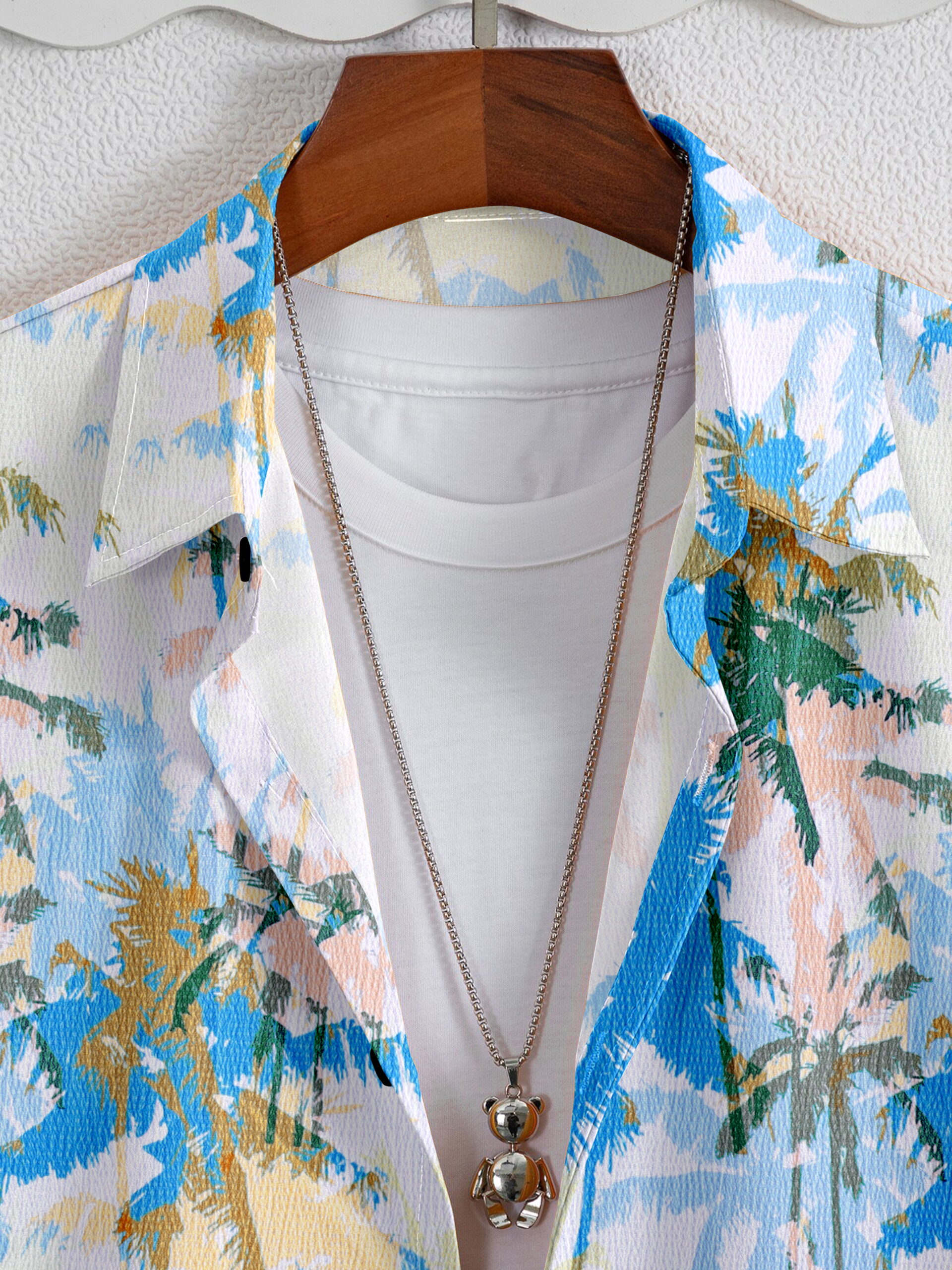 The Sunset Palm Paradise Shirt features soft peach and blue tones with palm detailing for the perfect holiday look. Lightweight and breezy, it’s great for travel, brunches, and summer getaways.